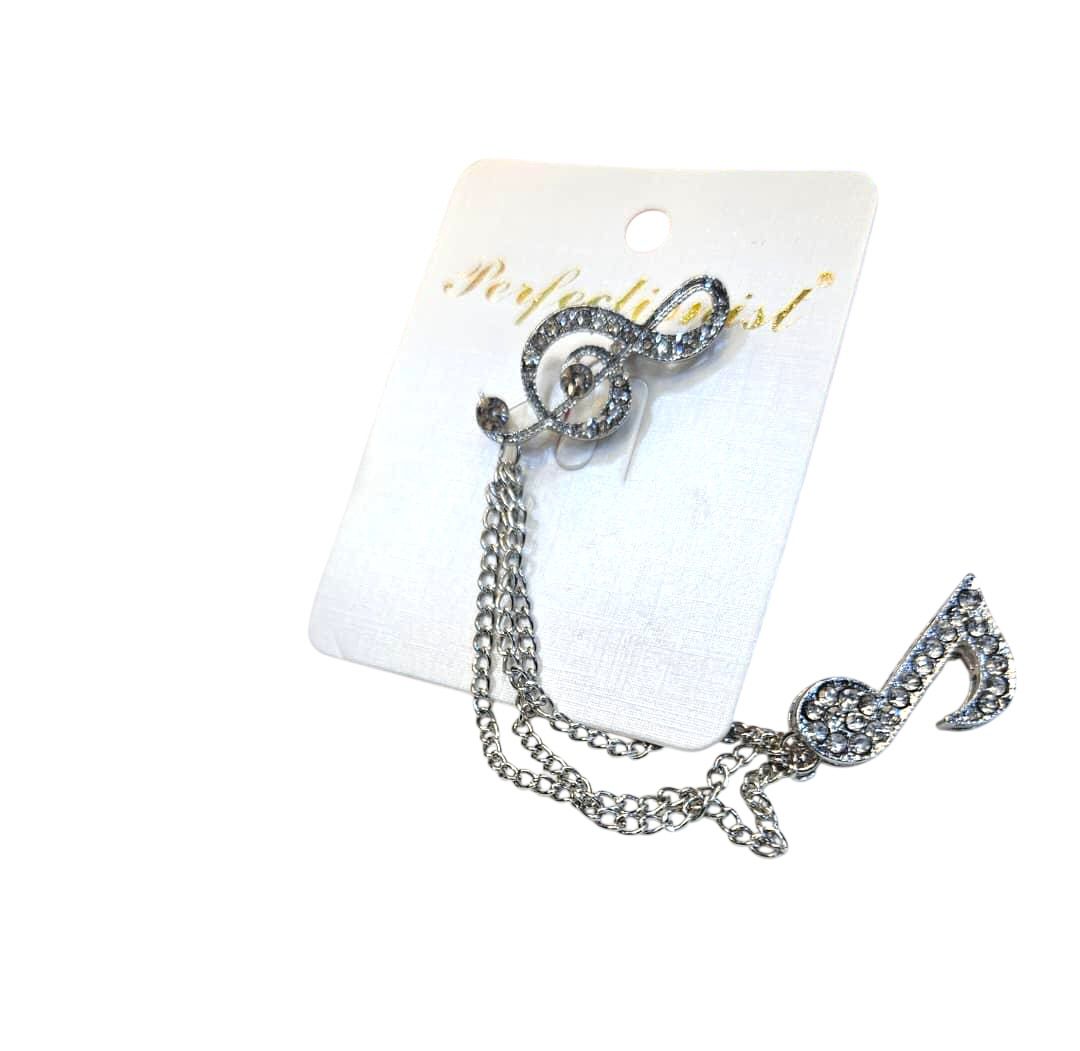 This versatile brooch features a charming delicate chain connecting the main treble clef to a small musical note accent, adding an extra layer of sophistication and movement. It can be effortlessly pinned onto various garments, from blazers and coats to dresses and scarves, instantly transforming your look with a touch of glamour.