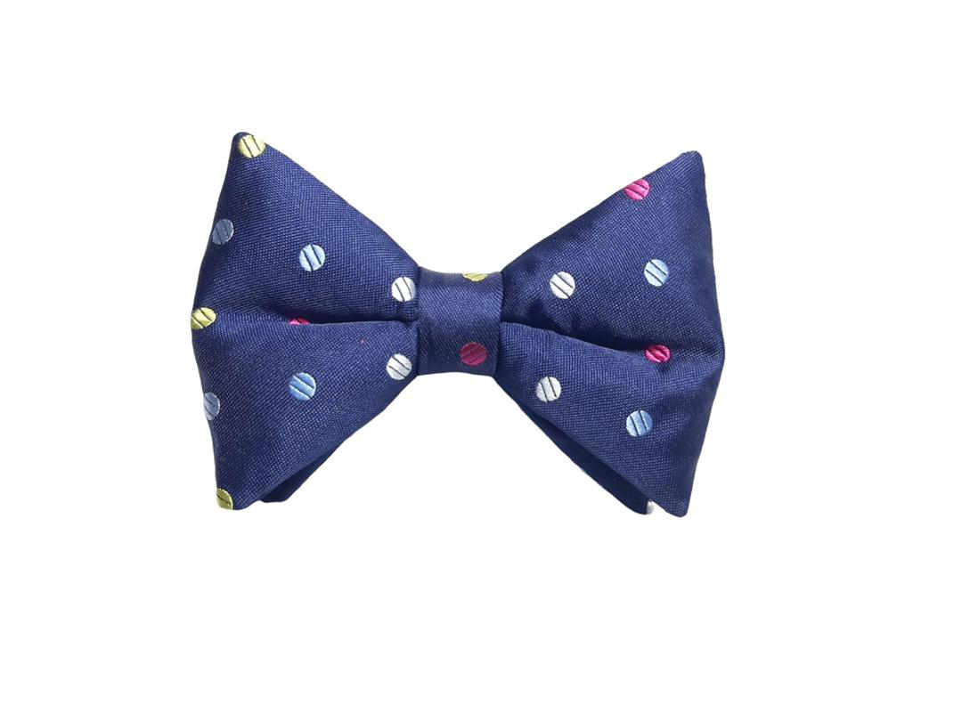 Elevate your style with our charming Navy Blue Polka Dot Bow Tie. This pre-tied bow tie is designed for the modern gentleman who appreciates a touch of whimsy and sophistication. The rich navy blue fabric provides a timeless base, while the scattered multi-colored polka dots in shades of pink, yellow, and light blue add a distinctive and cheerful character to your attire.
