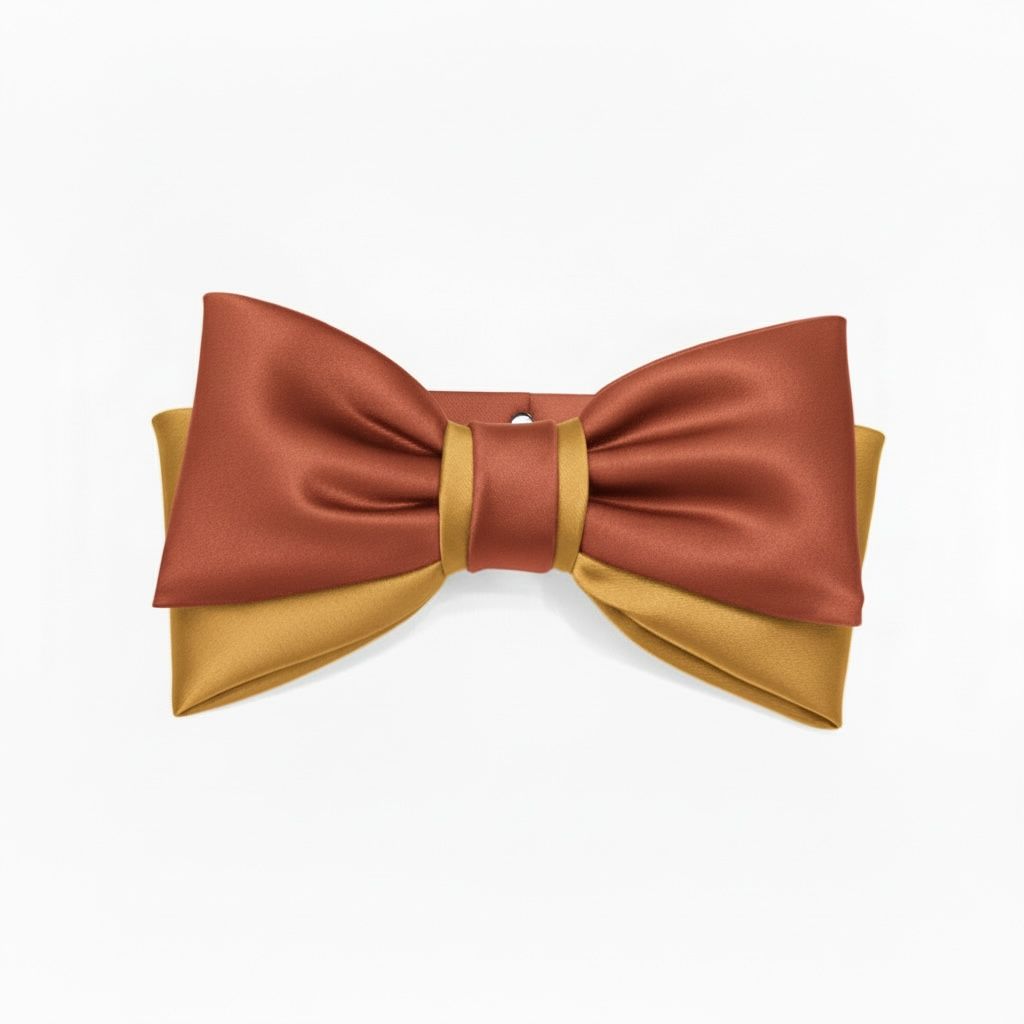 Add a touch of sophisticated charm to your ensemble with this exquisite two-tone satin bow tie. Expertly crafted, this bow tie features a luxurious blend of deep brown and shimmering gold, creating a captivating contrast that is sure to turn heads. Whether you’re attending a wedding, a gala, or a sophisticated dinner party, this accessory is designed to enhance your look with effortless style.